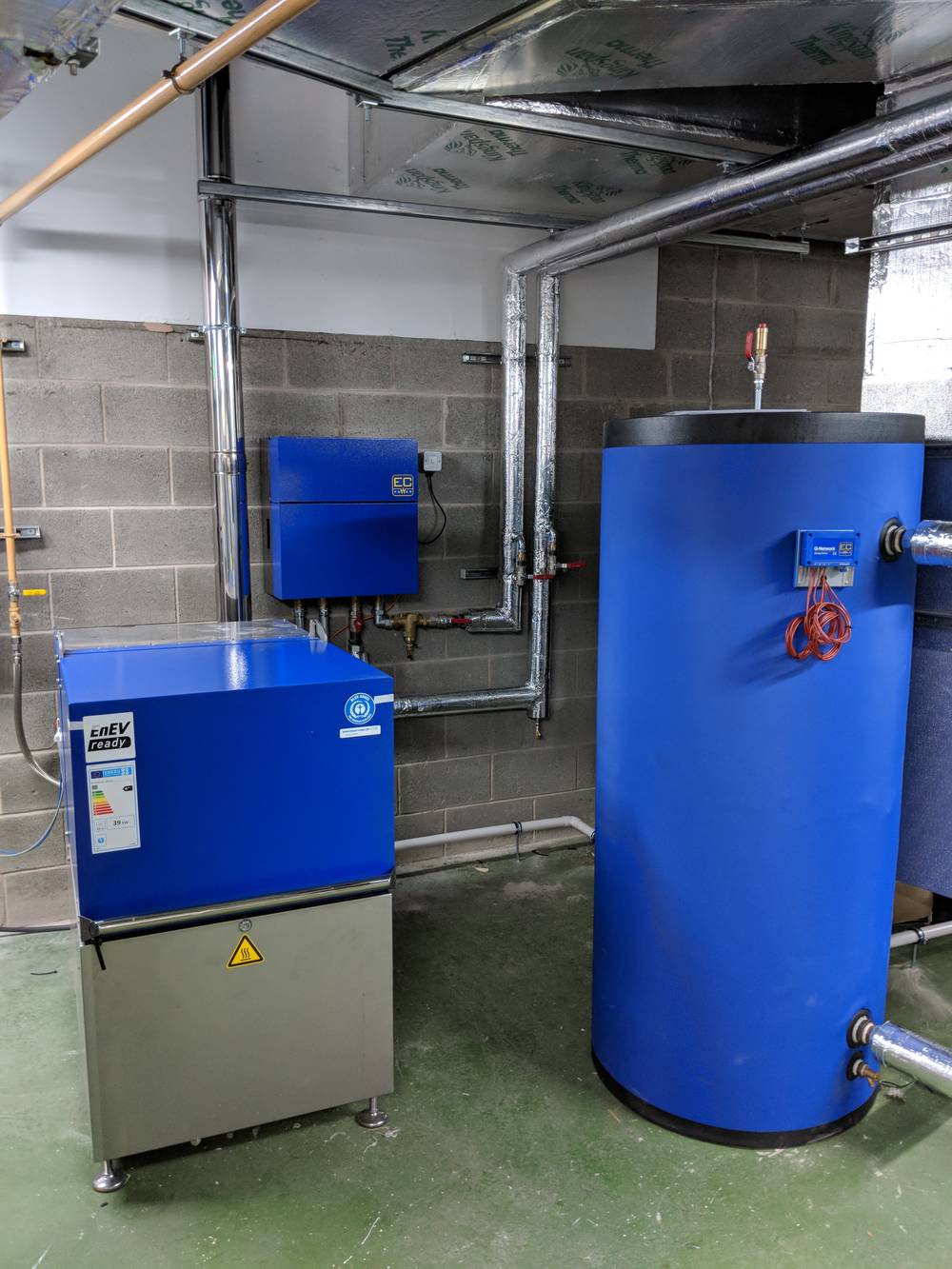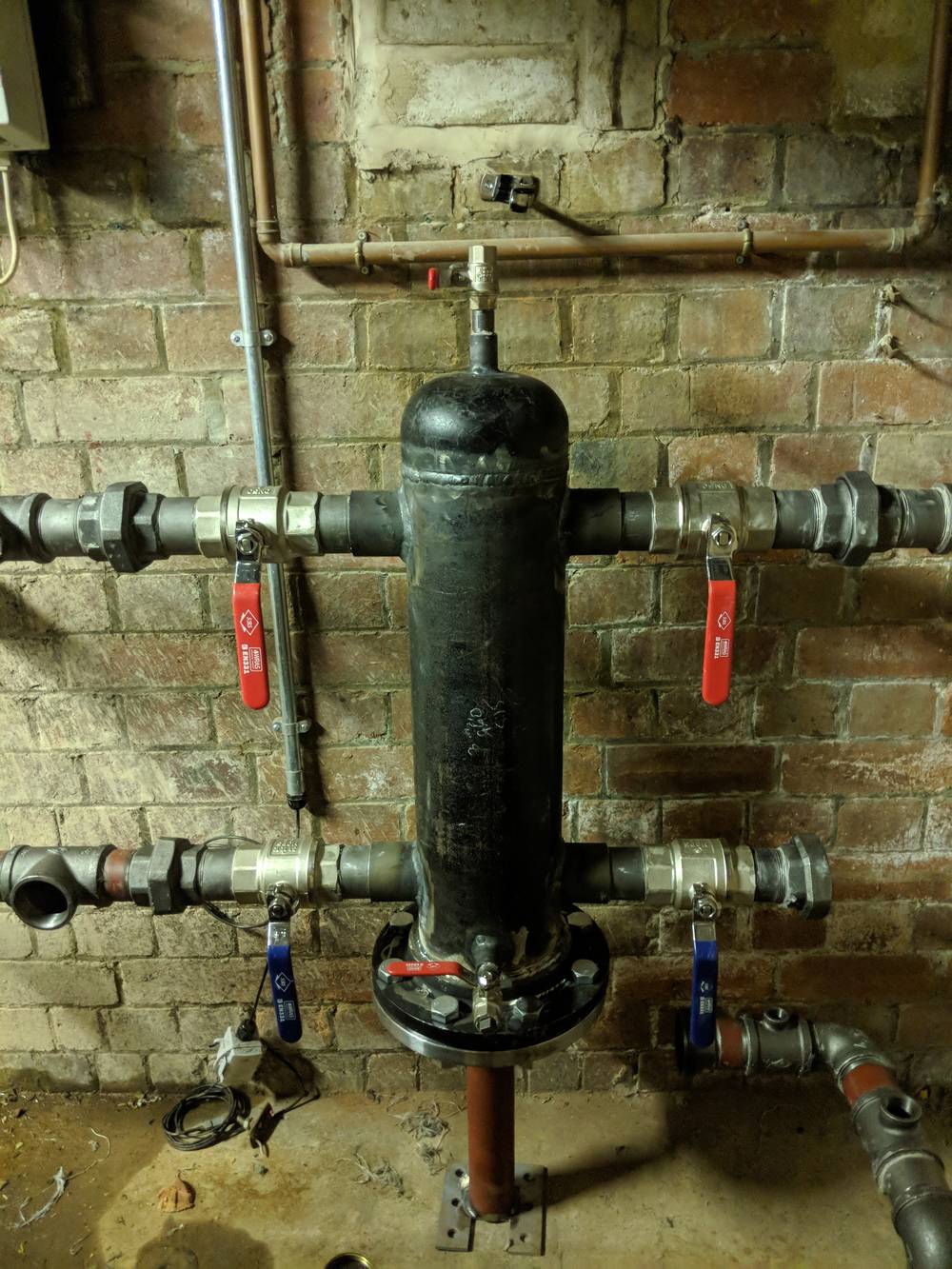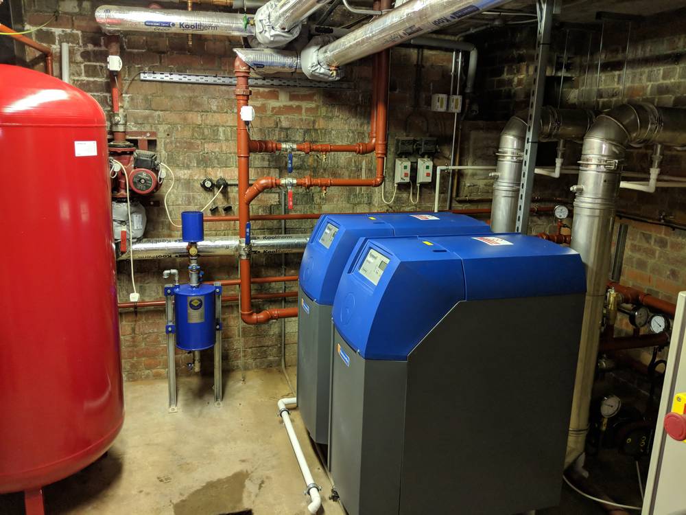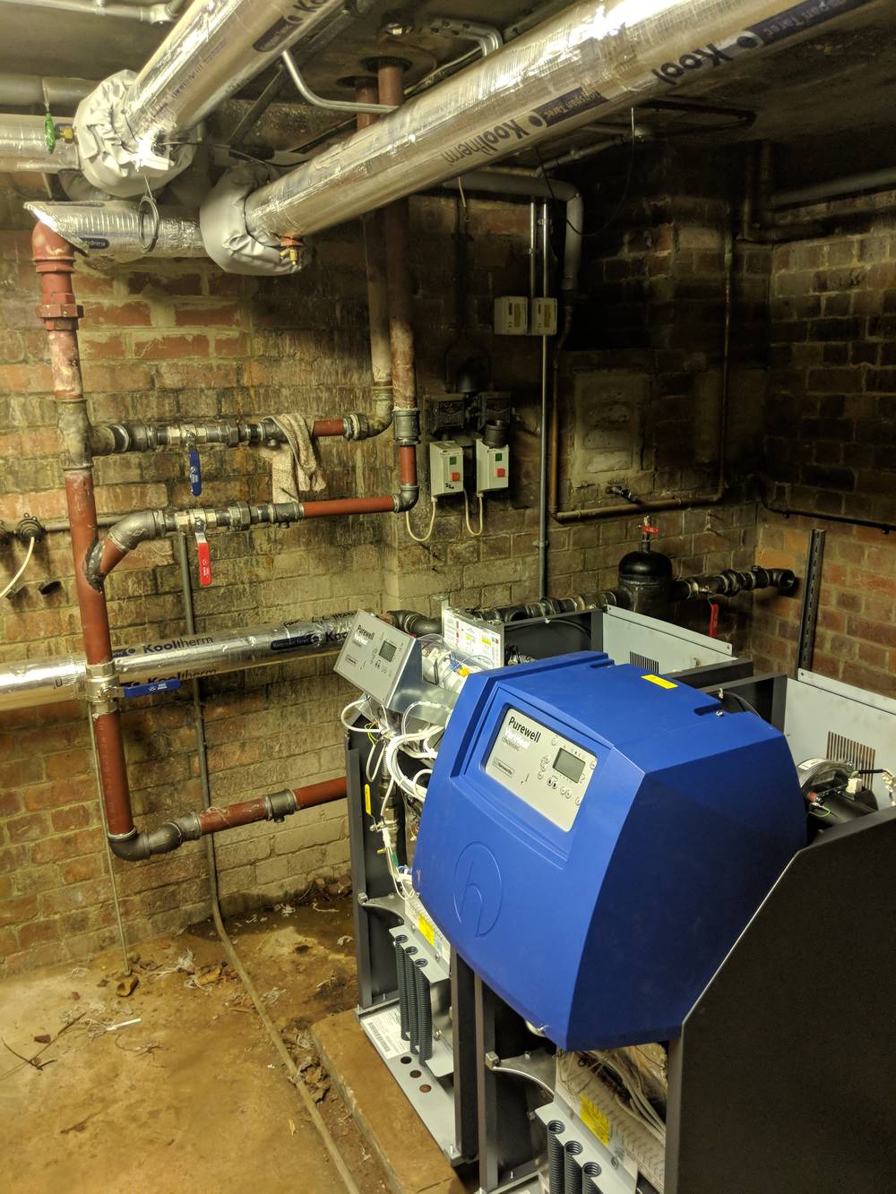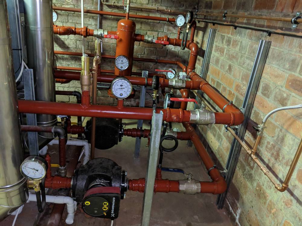 Removed old inefficient gas boilers and replaced with new A rated Hamworthy with fabricated low loss header and heat recovery injection on return.